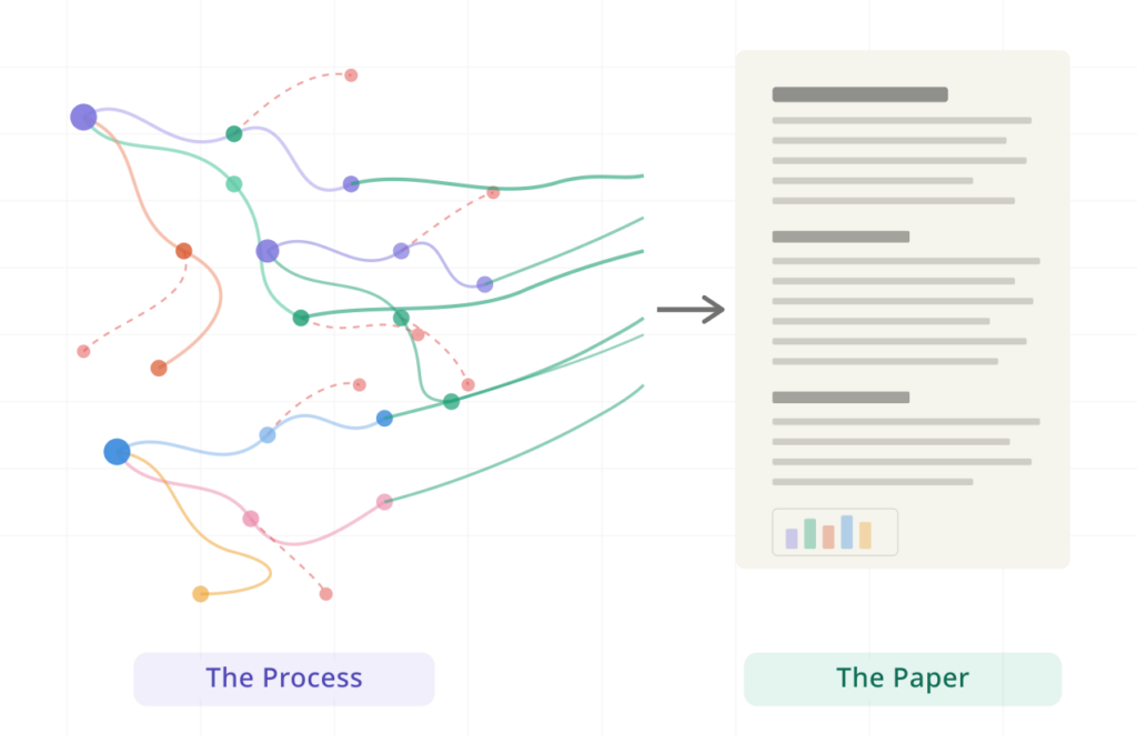 https://blog.communitydata.science/wp-content/uploads/sites/5/2026/03/cdsc_… Visualization of the messy process that turns into the polished paper. Image generated by claude.ai.